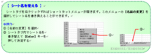 シート名は、シートタブ(B)を右クリックして表示されるショートカットメニューの[名前の変更(R)]で変更することができます。シート名を変更した場合は、変更した名前を使います。