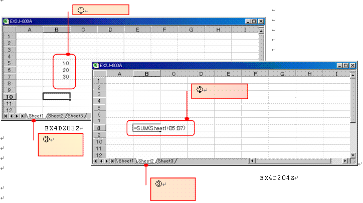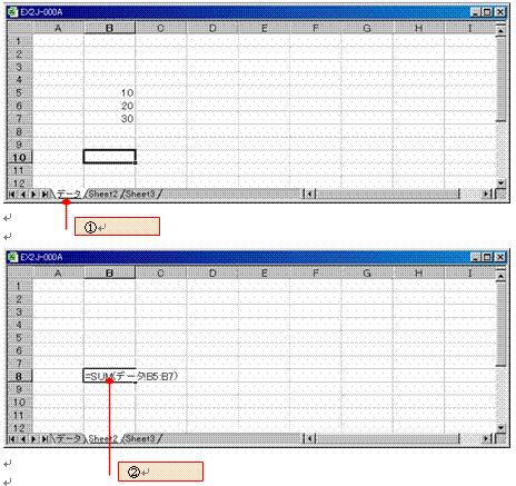 Excelは複数のシートを一度に処理することができるので、他のシートに入力されているデータを使う場面があります。たとえば、シート1に入力されているデータをシート2で使う場合、シート名を付けたセル番地またはセル範囲で指定します。シート名とセル番地を記号(!)でつなぎます。
