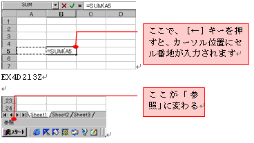 セルに関数を入力しているとき、矢印キーを押すとセル番地が入力されたり、セル内のカーソル(文字カーソル)が移動したり、そのときにより動作の違う場合があります。これは入力モードが、入力状態、と、編集状態、の違いによります。