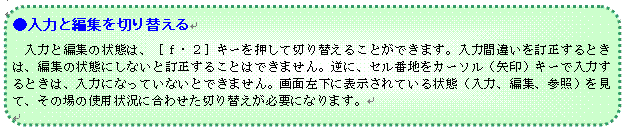 セルにセルポインタを合わせてキーボード上の何かのキーを押すと、入力モードが入力状態になり、状態を現す「入力」が画面の左下に表示されます。この状態で入力を続けているときは、矢印キーを押すとセル番地が入力されます。編集になっているときは、文字カーソルが移動します。2つの状態は、[F2]キーを押して切り替えることができます。また、セル番地を入力しているときは、状態表示が[参照]の表示になります。