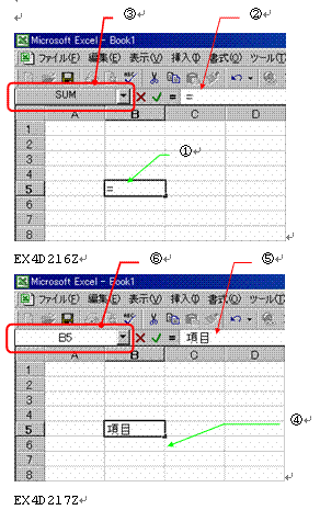 キーボードから何かの文字を入力すると、セルポインタの位置するセルに入力され、そのセルと数式バーに入力内容が表示されます。1文字目に=(全角、半角、どちらでも可)を入力すると、数式入力と判断され、セル番地が表示されていたところに関数名が表示されます。