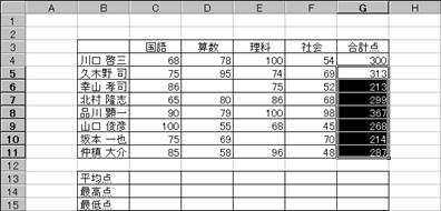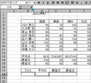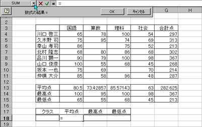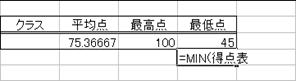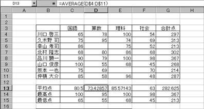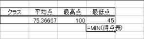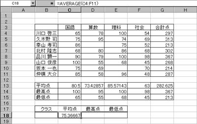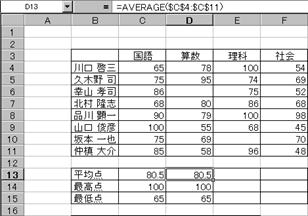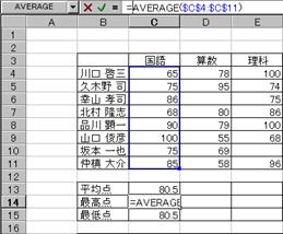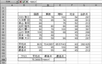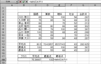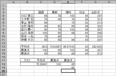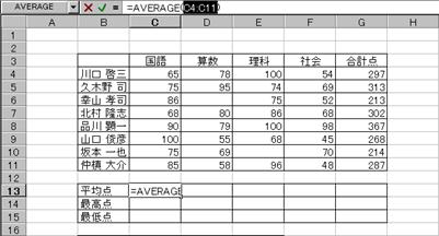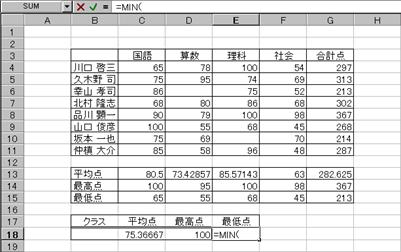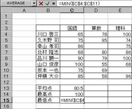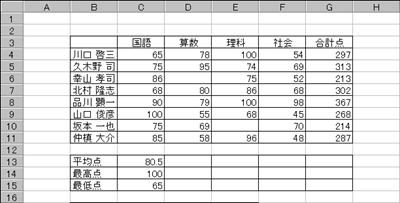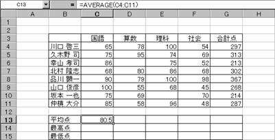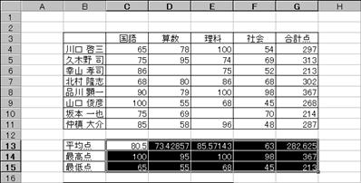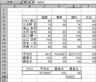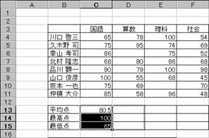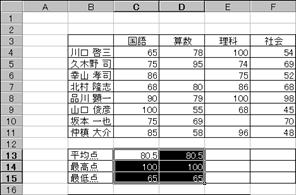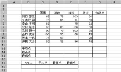 同じ数式を使うときだけでなく、数式を複写して関数名だけを書き替えて入力の手間を省くといったときにも複写を利用します。ここで、各科目ごとの平均点と最高点、最低点を求める関数を例に操作してみましょう。使用する関数は以下になります。