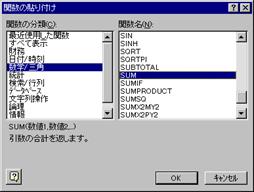 目的のSUM関数は関数の分類[数学/三角]に登録されているので、[数学/三角]を選択して右側のウィンドウに表示される一覧からSUMを探します。
