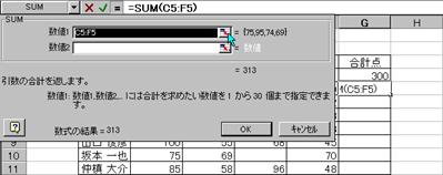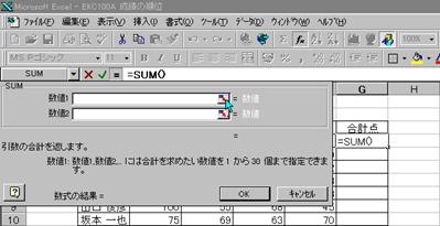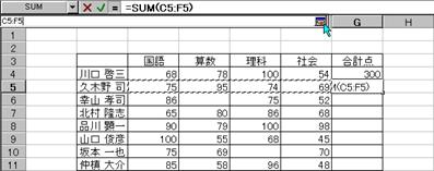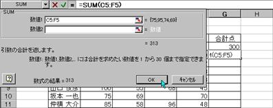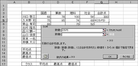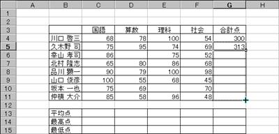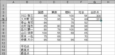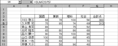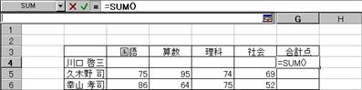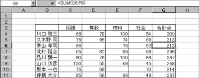 簡単な関数(入力字数の少ない関数など)はキーボードからセルに直接入力しる方が簡単です。すでに理解していることと思いますが、合計を求めるSUM関数を例に入力してみましょう。セルG4に全科目の合計を求めるSUM関数を入力します。