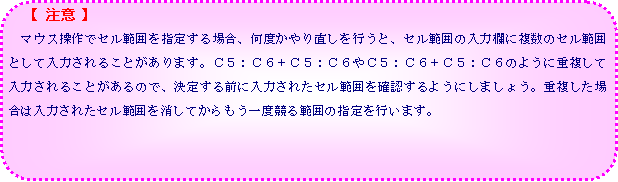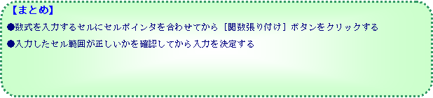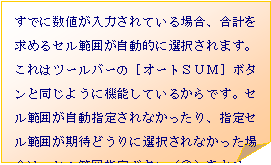 SUM関数の働きは、横に並ぶセル範囲、縦に並ぶセル範囲、あるいは箱形で指定するセル範囲の数値の合計を計算します。数値でないセルは値0として計算されます。SUM関数の括弧()の中に合計を計算するセル範囲を入力します。先頭のセル番地と最後のセル番地をコロン「:」で繋いで入力します。
