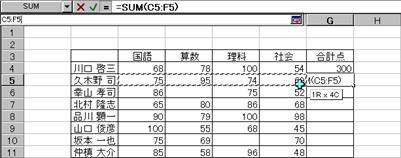 複写元のセルに入力している数式は次の内容でした。この数式の意味は、セルC5〜F5に入力されている値を合計する、ことですね。