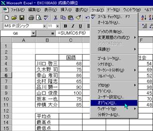 複写元に入力している数式は=SUM(C5:F5)なのに複写先は=SUM(C6:F6)になっています。複写したので同じ数式が複写されて当然なのですが、セル番地だけが自動的に変更されています。これは見かけ上のことであって、実はまったく同じ数式が複写されているのです。このままでは、何のことなのか理解しにくいと思うので、次の操作でセル番地の表示方法を変更することにします。