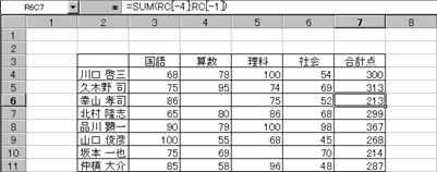他の複写した数式もすべて同じ数式になっていますね。この数式の意味は、R(R[0]のこと)つまり縦方向に変化せず、C[−4]つまり横方向の左へ4つ進めたセルからC[−1]横方向の左へ1つ進めたセルまでを合計する、ということになります。この数式なら、どのセルへ複写しても計算するセル範囲は、数式を入力したセル位置から左4つ進め目のセルから左1目のセルを合計する、ことになり、複写した数式でも期待した計算結果が得られた、ということになります。このセル番地の指定方法のことを相対セル番地といいます。通常はこの相対セル番地で入力されるので、相対セル番地である、ということを意識しなくていいようになっています。相対セル番地に対して、必ずこのセル位置だ、と決めつけたセル番地の指定方法を絶対セル番地といいます。