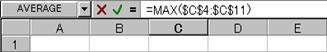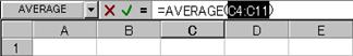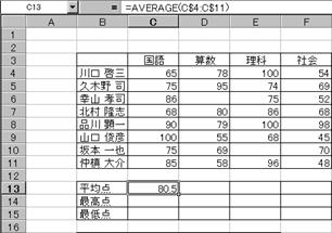 最初に=AVERAGE(C4:C11)を入力して、引数の部分をMAX関数とMIN関数に利用してみましょう。入力内容はそれほど多くないので、複写を利用せずに入力する方が簡単ですが、先の相対セル番地の確認を兼ねた解説を続けます。まず、次の操作で平均値を求める数式をセルC13に入力してください。入力操作は[関数張り付け]を使ってもかまいませんが、以下の操作はキーボードから入力しています。