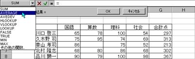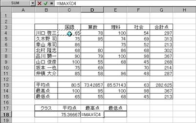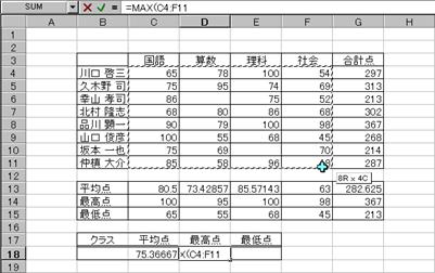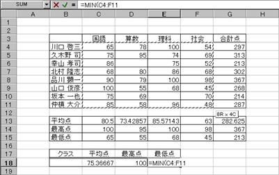 これらの関数はSUM関数と同じように、値を求めるセル範囲を指定します。図Aで国語の場合、セル範囲はC4:C11になりますね。これを関数に入力すると次のようになります。