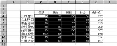 操作例として使う集計表(図A)を作成してください。合計や平均値を求める数式は後の操作で入力するので、図Aの状態では入力していません。データ(点数)は同じ値を入力しなくてもかまいませんが、結果を図と同じにして照合しやすくするために同じ値を入力してください。とくに空白セル(セルD8とE10)も同じにしておいてください。空白は欠席として「得点なし」を意味するようにしています。