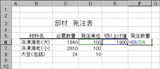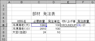 @セルE6に必要数量から切り上げ値を求める数式を入力する
