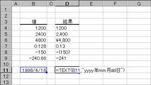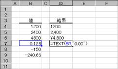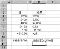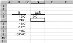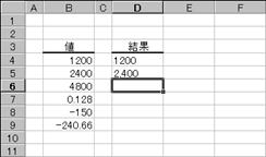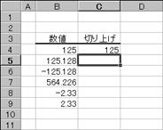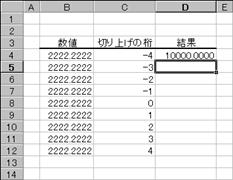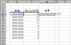 次の例は同じ値(2222.2222)を異なる桁数で切り上げています。セルの表示桁数は、小数点以下4桁に揃えています。結果を確認しておいてください。