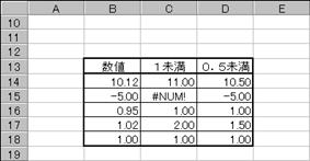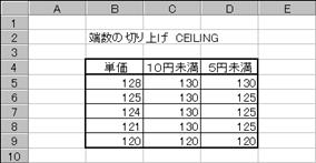 次の例は、商品単価などの金額に端数を出さないようにしています。たとえば、単価が128円のとき10円以下を切り上げた単価にする、あるいは5円以下を切り上げた単価にまるめ(切り上げ)る働きをします。セルC15の例は、数値と基準値の符号が異なるエラーの見本です。