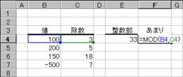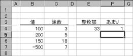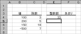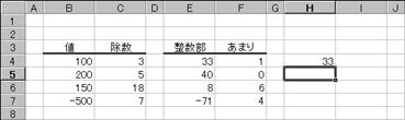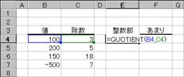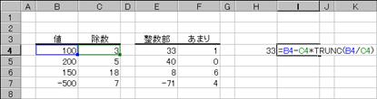 また、分析ツールを組み込まないで行う場合、TRUNC関数を使って次のように代用できます。INT関数でも可能ですが、分子が負数のとき負方向に1つ大きな値になってしまいます。