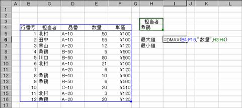 =DMAX(B4:F16,”数量”,H3:H4) ・・・ 最大値