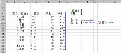 =DMIN(B4:F16,”数量”,H3:H4) ・・・ 最小値