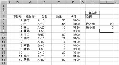 次の例は、商品販売の履歴簿をデータベースのデータ範囲として、担当者が取り扱った販売品の数量から最大値と最小値を抽出しています。検索条件は、図AのセルH3:H4のようにフィールド名(担当者)と検索データ(桑鶴)を縦に並べて入力しておき、データベース関数の引数としてセル範囲(H3:H4)で指定します。各数式は以下のようになります。