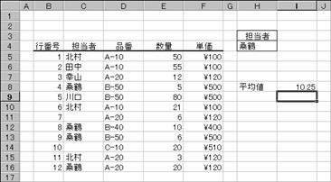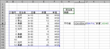 次の例は、商品販売の履歴簿をデータベースのデータ範囲として、担当者が取り扱った販売品の数量の平均値を求めています。検索条件は、図AのセルH3:H4のようにフィールド名(担当者)と検索データ(桑鶴)を縦に並べて入力しておき、データベース関数の引数としてセル範囲(H3:H4)で指定します。数式は以下のようになります。