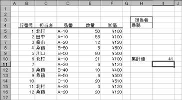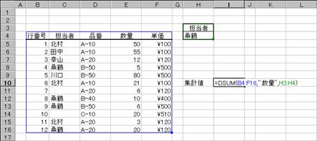 次の例は、商品販売の履歴簿をデータベースのデータ範囲として、担当者が取り扱った販売品の数量の合計を求めています。検索条件は、図AのセルH3:H4のようにフィールド名(担当者)と検索データ(桑鶴)を縦に並べて入力しておき、データベース関数の引数としてセル範囲(H3:H4)で指定します。数式は以下のようになります。