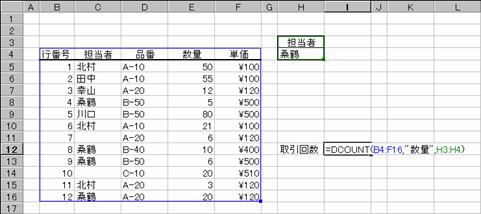 次の例は、商品販売の履歴簿をデータベースのデータ範囲として、担当者が取り引きした回数を求めています。検索条件は、図AのセルH3:H4のようにフィールド名(担当者)と検索データ(桑鶴)を縦に並べて入力しておき、データベース関数の引数としてセル範囲(H3:H4)で指定します。