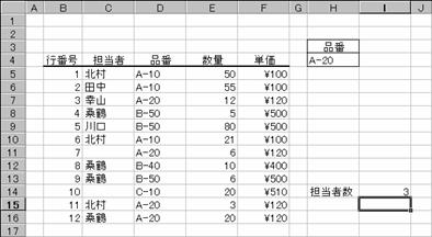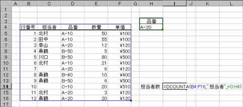 次の例は、商品販売の履歴簿をデータベースのデータ範囲として、1つの商品に対して何人の担当者が取り引きしたかを求めています。検索条件は、図AのセルH3:H4のようにフィールド名(品番)と検索データ(A−20)を縦に並べて入力しておき、データベース関数の引数としてセル範囲(H3:H4)で指定します。
