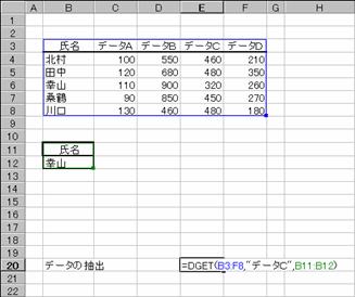 次の例は、データの一覧表をデータベースのデータ範囲として、氏名を検索条件に指定するフィールド「データC」の値を求めています。検索条件は、図AのセルB11:B12のようにフィールド名(氏名)と検索データ(幸山)を縦に並べて入力しておき、データベース関数の引数としてセル範囲(B11:B12)で指定します。数式は以下のようになります。