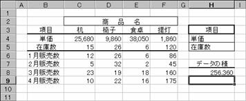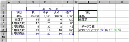 検索条件に指定した「単価」(セルH4)と「在庫数」(セルH5)のそれぞれをフィールド(数式内に記述した「椅子」)の列から抜き出して、積算した値が求められています。2つ目の検索条件(セルH5の「在庫数」)を他の項目名(「1月販売数」など)に書き替えれば、その値が計算されます。