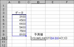 同じように10個目のデータは次のように予測できます。この関数では、係数を返すのでSUM関数とかけ算を組み合わせて値を求めるようにします。
