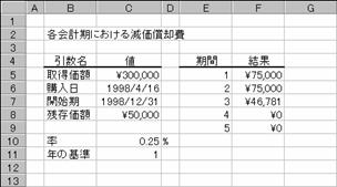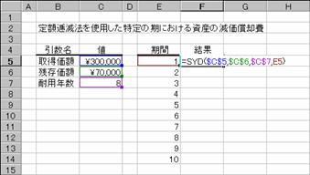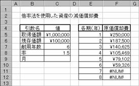 減価償却費を求める関数として、定率法(DB関数)、倍率法(DDB関数)、定額法(VDB関数)、を使ったものが組み込まれています。それぞれの関数に指定する同名引数の単位や内容は共通仕様になっています。