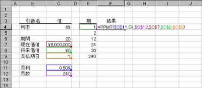 借入金800万円を年利6%の20年ローンで借り入れた場合、各期(各月)の金利支払額は次のように求められます。(月利、月数はP___を参考)