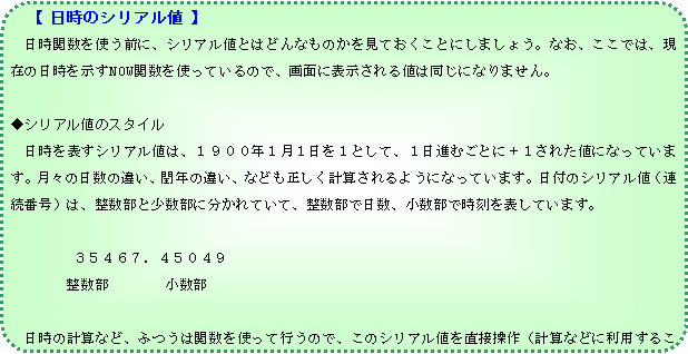 ここでは、日時処理に使う関数の使い方を解説します。日時は、シリアル値と呼ばれる値を基準に作動しています。まずはじめに、シリアル値について理解を深めてください。