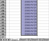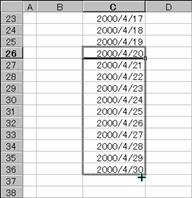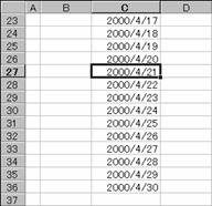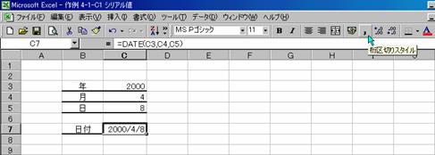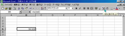 [桁区切りスタイル]ボタンは、整数部だけが表示される表示形式に設定されます。したがって、この場合は、日付(時刻の小数部を除く)のシリアル値が表示されることになります。シリアル値の整数部分は日時の日にあたる連続番号になっています。ここで表示された値は小数点以下1桁目で四捨五入された値なので、現在のシリアル値として正しくない場合があります。