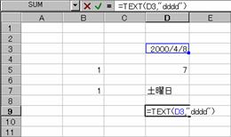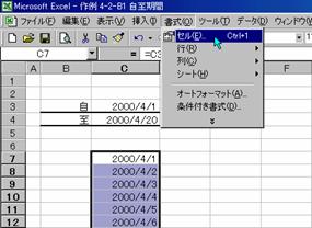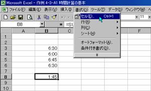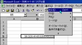 日付や時刻を表示するつもりで、入力した関数がシリアル値を表示したとき、そのセルの表示形式を日時に変更します。表示形式の変更は[書式(O)]e[セル(E)s]で操作します。