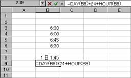 セルI5に =DAY(H5)*24+HOUR(H5) を入力して、[桁揃えスタイル]ボタンで表示形式を数値に設定する