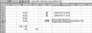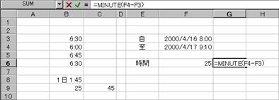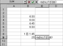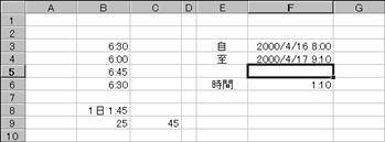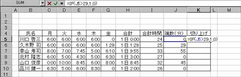 時間を集計する表などでは、1時間にみたない分の処理方法が問題になる場合があります。切り捨てるなら求めた時間をそのまま使えばいいのですが、切り上げや30分未満は切り捨て、などの処理を施す場合、少しの工夫が必要です。切り上げの処理を考えてみると、求めた時間を+1する、しない、になりますね。たとえば、29分までは切り捨て、30分から切り上げるなら、分を検査して29分以上のとき1、そうでないとき0、を表示して、時間に表示内容を加えれば、四捨五入と同じ効果が得られます。