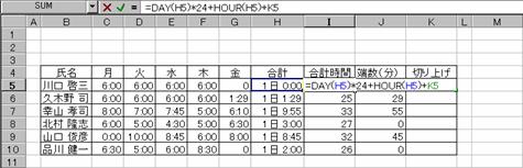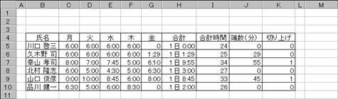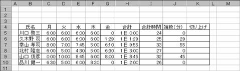 この値は、切り上げ値が0なので、合計時間は変化しません。セルI5とK5をされざれ下へ続くセルに複写して式を完成させると以下のような結果になります。