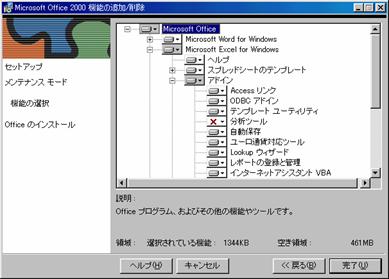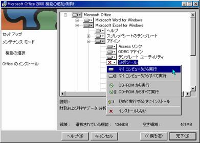 アドイン一覧に[分析ツール]が見あたらないときは、セットアップ操作で組み込みを行います。Excelやオフィスバーなど起動しているアプリケーションがあれば、それらを一旦終了してから以下の操作を行ってください。Excel2000やOffice2000のCD−ROMをドライブにセットして操作を進めます。以下の操作例はOffice2000を使っています。