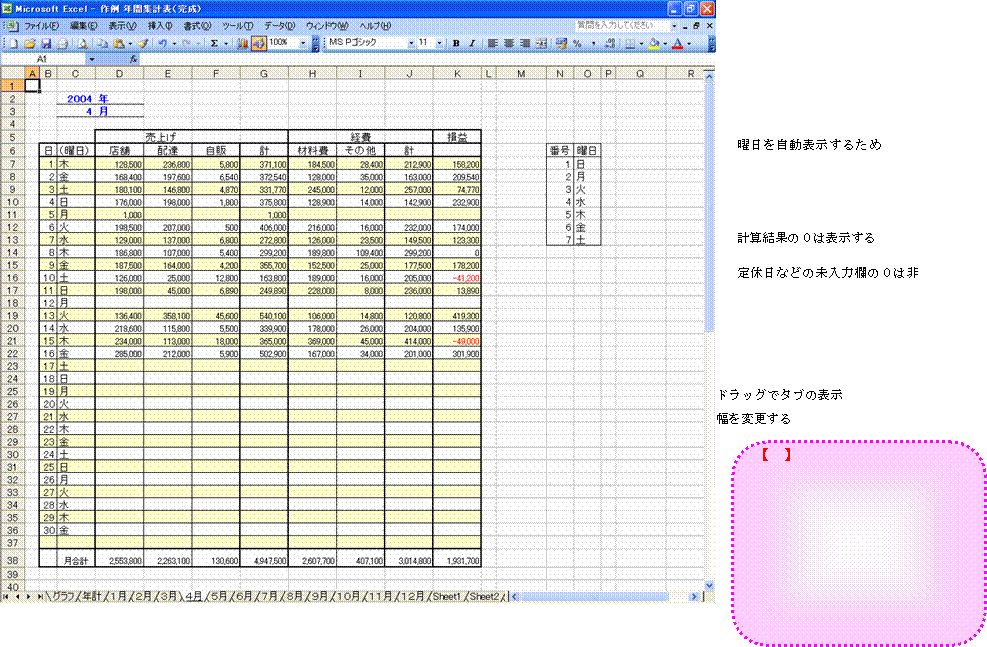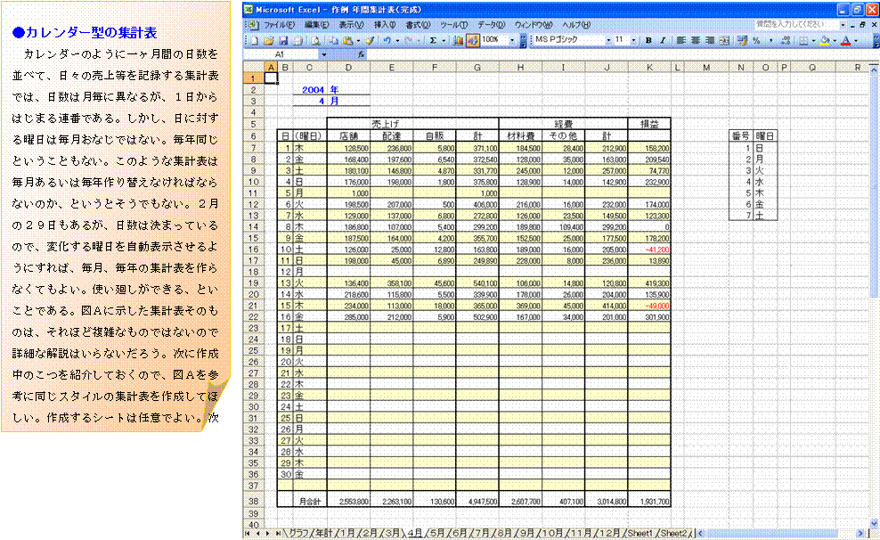 今回から3回の予定で年間の集計表を作成する。月間集計として1枚のシートに1月分のカレンダースタイルの集計表を作成して、12枚のシートで12月分の年間集計を求める方法を紹介する。