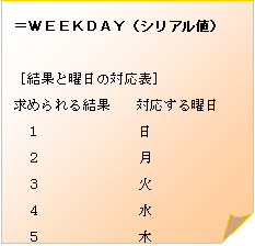 操作Aで求められた結果は5なので、WEEKDAY関数の[結果と曜日の対応表]から1999年4月1日は木曜だということが分かる。しかし、このままだと、曜日が数字で表示されるので分かりにくく、実用的ではない。そこで、以前に使ったVLOOKUP関数を応用して、曜日の番号から漢字の曜日を抽出して表示するようにする。この動作は品番から品名を抽出するのと同じだ。曜日の番号と漢字の曜日を一覧にしたテーブルを作成して(図E)、数式を次のように書き替えればよい。2行目にも数式を入力して、先ほどのコピー操作とどうように、2つのセルを選択して下へ続くセルに複写すればよい。表示される曜日は数式で求めているので、セルC2の年やセルC3の月を書き替えれば該当する曜日に自動的に変更させることができる。