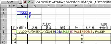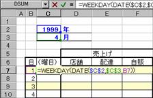 =WEEKDAY(DATE($C$2,$C$3,B7)) −−− 数式A
