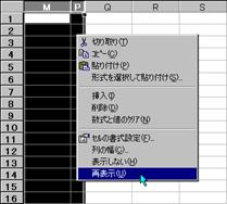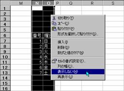 曜日を抽出するために使用するテーブルなどは、常時表示されている必要はない。目障りな場合は、列単位で列ごと隠してしまうことができる。以前に紹介した表示形式で消す方法だと、そのセルが空いているものだと勘違いして何かを入力してしまう危険性がある。列に他の入力が無いなら列ごと隠してしまうことで、セルを選択することすらできなくなるので間違えて消したり書き替えたりする危険性ない。また、簡単な操作で隠した列を元通りに表示することもできる。