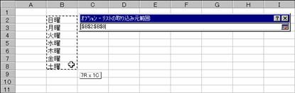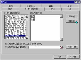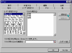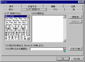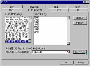 シートに入力している内容を登録したければ、ユーザー設定リストのインポートを使って登録できる。たとえば曜日は、日、月、火、のように何曜日の曜日の付いていないスタイルと付いているスタイルがあらかじめ登録されているが、日曜、月曜、火曜、のように何曜日の日を省いたスタイルは登録されていなので、このリストを登録する場合、連続するセルに入力しておき、インポート操作を行う。