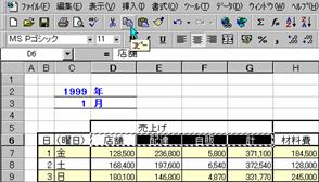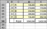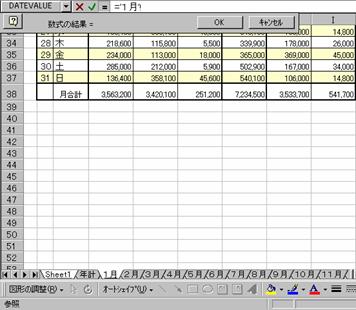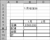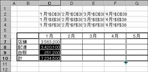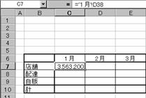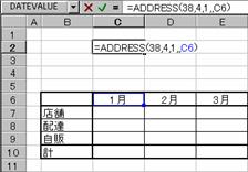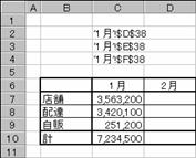 たとえば、1月の店舗売上額(図4−1で示すセルD38)なら次のような式になる。以下の数式を集計表のじゃまにならないところ(ここではセルC2)に入力する。結果は、先にマウス操作で入力したセル番地と同じセル番地('1月'!D38)が返される。