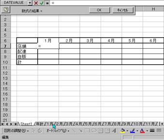 同じシート内のセルを参照するためのセル参照式はセル番地を記述するだけでよい、しかし、他のシートに入力している値を参照するセル参照式はシート名とセル番地を記述することになる。たとえば、1月の店舗売上額なら次のような参照式になる。1や2つならキーボードから入力しても苦にならないが、数が多いとやっかいな作業だ。