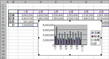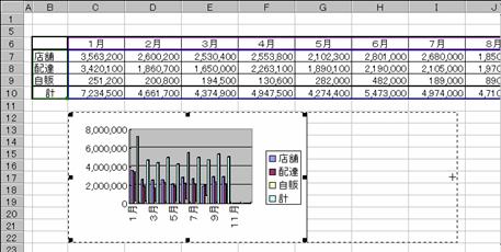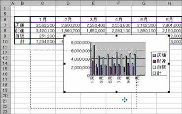 グラフは、ツールバーの[グラフウィザード]ボタンで簡単に作成できる。グラフにするデータ範囲を選択状態にして、ボタンをクリックすればグラフウィザードが起動する。グラフの種類を選択して完了すれば、即座にグラフが表示される。既定値のサイズでできあがるので、適切にサイズ変更して、見やすい位置へ移動すけばよい。サイズ変更は、グラフの周りに表示される■にマウスポインタを合わせ、ドラッグ&ドロップすればよい。グラフ内部の白い部分をドラッグ&ドロップすれば表示位置の移動になる。