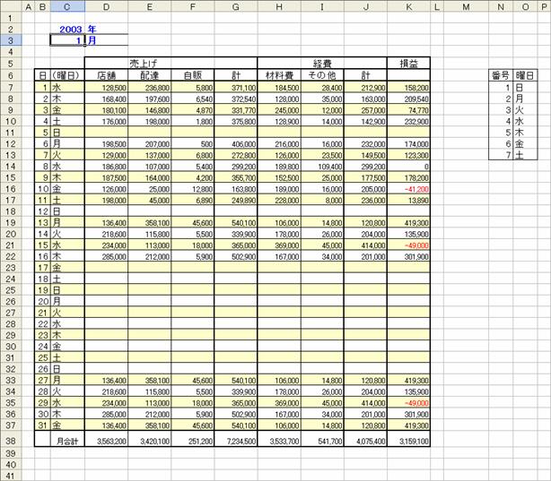 次回(第9回)週単位の集計表を作成する。曜日の表示を固定(一覧形式)に並べて日を自動表示させる
