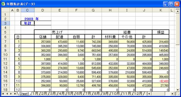 列の項目名は各月のシートに付けた同じ名前を使うことにする。これは、上級編で解説することに関係する。例のように1月、2月、・・・と続く場合、1月だけを入力してドラッグ&ドロップで複写すればよい。