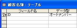 テーブルには主キーになるフィールドが1つ必要です。1つ目のフィールドを主キーに設定することにします。ただし、かならずしも1つ目のフィールドに設定する必要はなく、任意のフィールドに設定できます。主キーのフィールド名は自由に付けることができますが、ここでは「ID」とします。フィールドを新しく作成するのが普通ですが、ここでは編集操作の練習を兼ねて、先に作成した「会社名」を「ID」に変更して、主キーに設定してみましょう。データ型は、連続番号を自動的に付けるオートナンバー型を設定します。