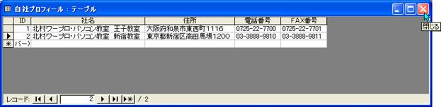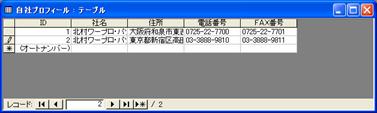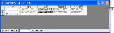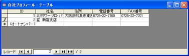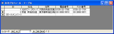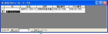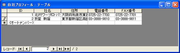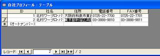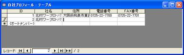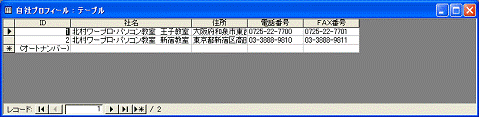 自社プロフィールは、請求書ごとに1か所に印刷され、その内容は1つに決まっています。データベース化しないで発行する伝票に直接入力すればいいように思えますが、ここで作成しているデータベースを拡張して、納品書、請求書などの伝票も発行するようにした場合は、伝票に印刷する自社プロフィールをテーブルから参照するようにしておいたほうが便利です。たとえば、自社プロフィールデータの中の電話番号が変更になった場合、テーブルのデータを書き換えるだけで各伝票のプロフィールがすべて自動的に変更できます。